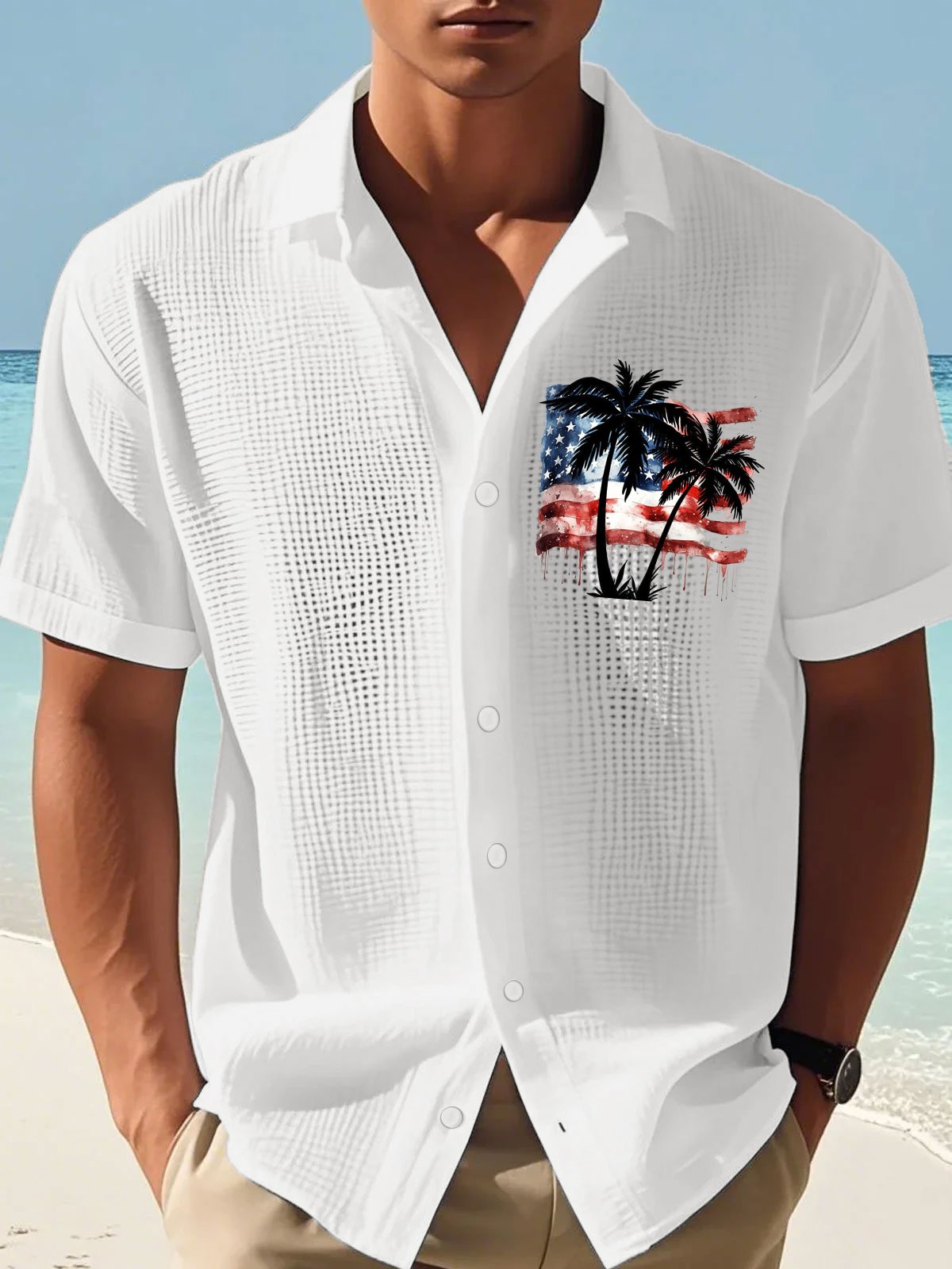 Men's Casual Flag Independence Day Coconut Tree Print Waffle Men's Shirt